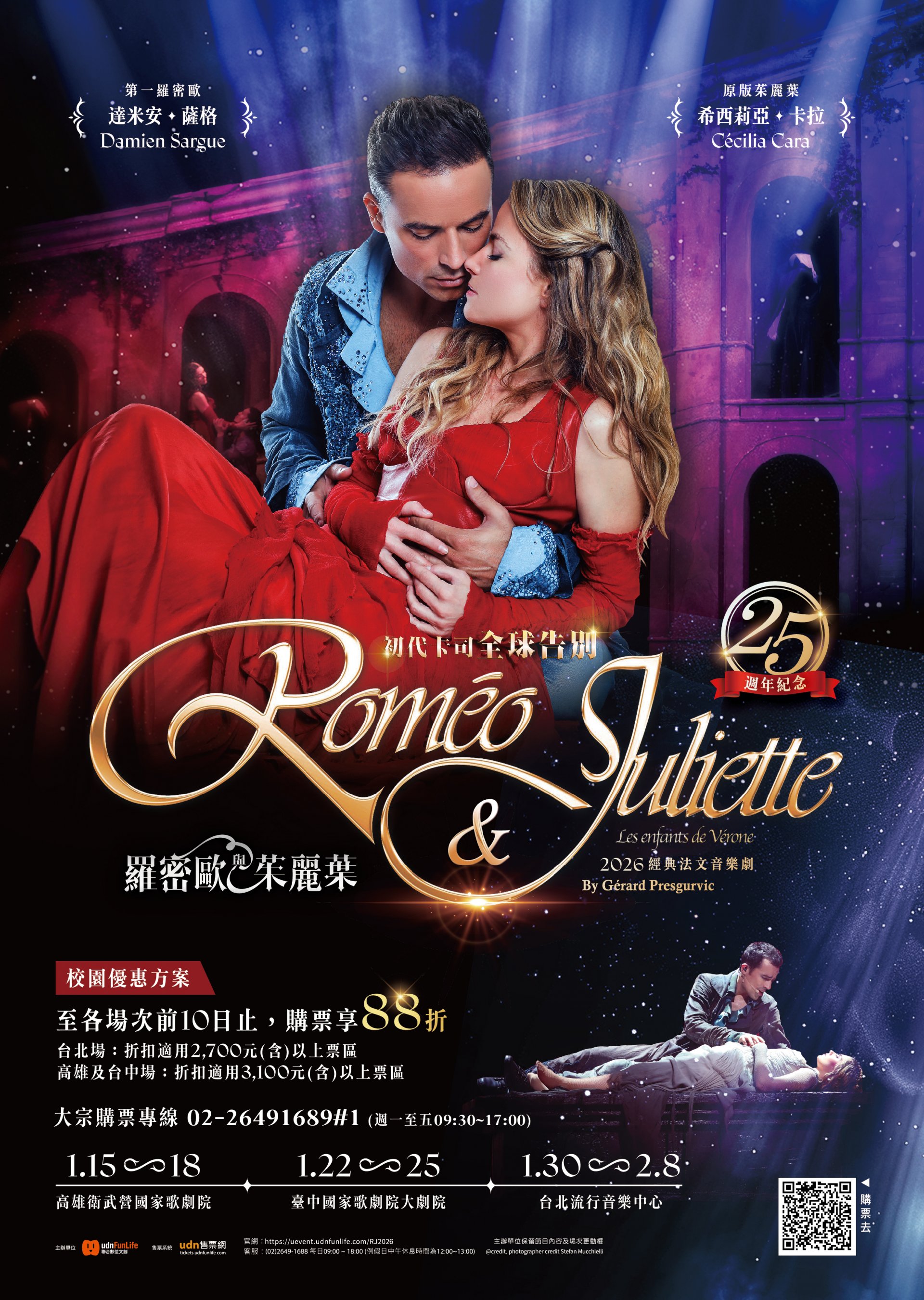 二、表演場次: (一)高雄衛武營國家藝術文化中心 歌劇院 1、2026年1月15日(四)19:30 2、2026年1月16日(五)19:30 3、2026年1月17日(六)14:30、19:30 4、2026年1月18日(日)14:30 (二)台中國家歌劇院 大劇院 1、2026年1月22日(四)19:30 2、2026年1月23日(五)19:30 3、2026年1月24日(六)14:30、19:30 4、2026年1月25日(日)14:30、19:30 (三)台北流行音樂中心 表演廳 1、2026年1月30日(五)19:30 2、026年1月31日(六)14:30、19:30 3、2026年2月 1 日(日)14:30 4、2026年2月 4 日(三)19:30 5、2026年2月 5 日(四)19:30 6、2026年2月 6 日(五)19:30 7、2026年2月 7 日(六)14:30、19:30 8、2026年2月 8 日(日)14:30 三、演出亮點: (一)法國音樂史上製作規模最盛大,被譽為「21世紀最偉大 的流行音樂劇」(二)25週年初代卡司全球告別巡迴,亞洲巡演最終站 (三)2001年首演後轟動全球,吸引超過650萬戲迷觀賞 四、購票優惠方案及票價: (一)校園團體優惠方案:至各場次開演前10天,購票享88 折。 1、台北場:折扣適用2,700元(含)以上票區 2、高雄及台中場:折扣適用3,100元(含)以上票區 (二)專屬訂購連結:https://pse.is/89ga3w